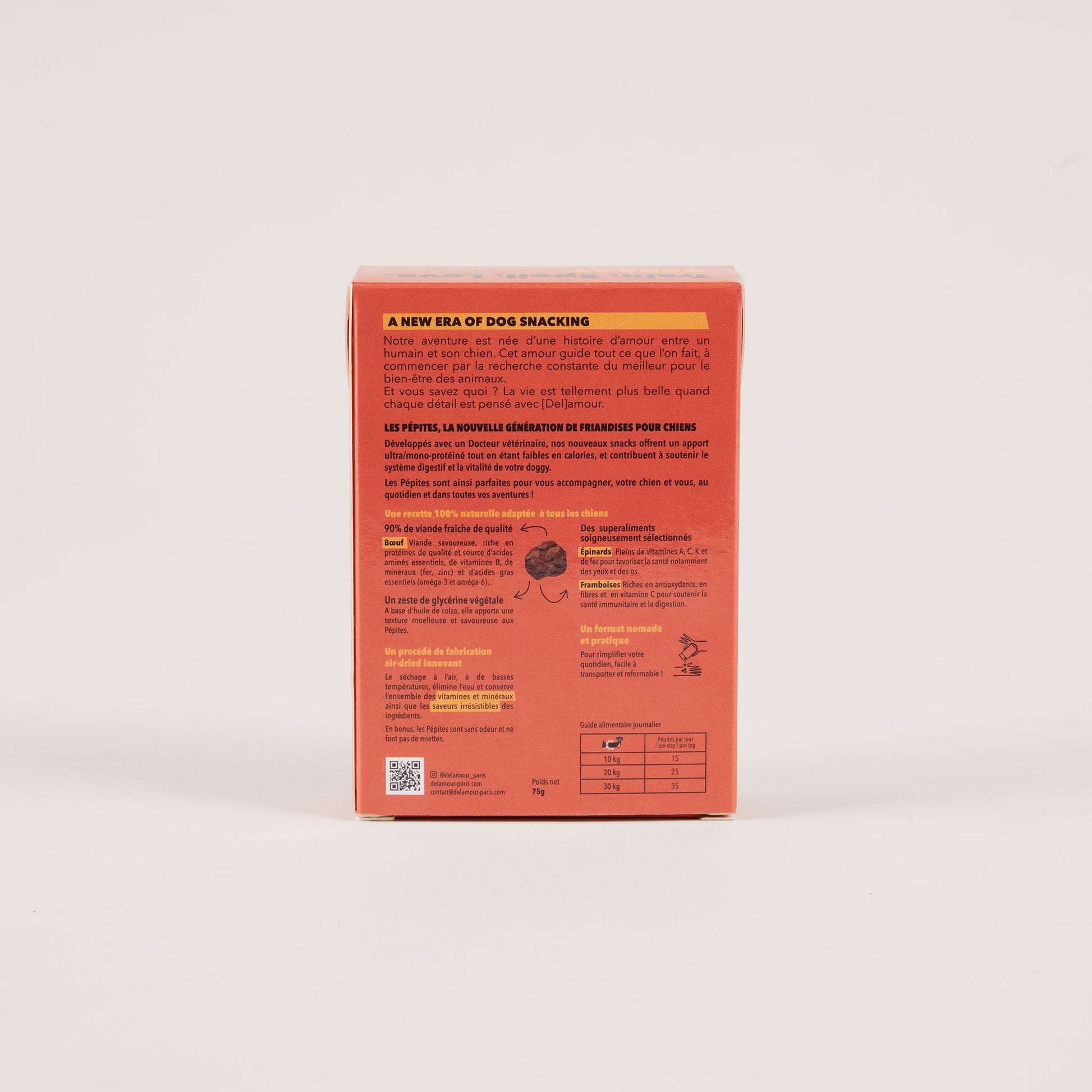 Composition : bœuf 90%, framboises 4%, épinards 4%, glycérine végétale naturelle 2%.