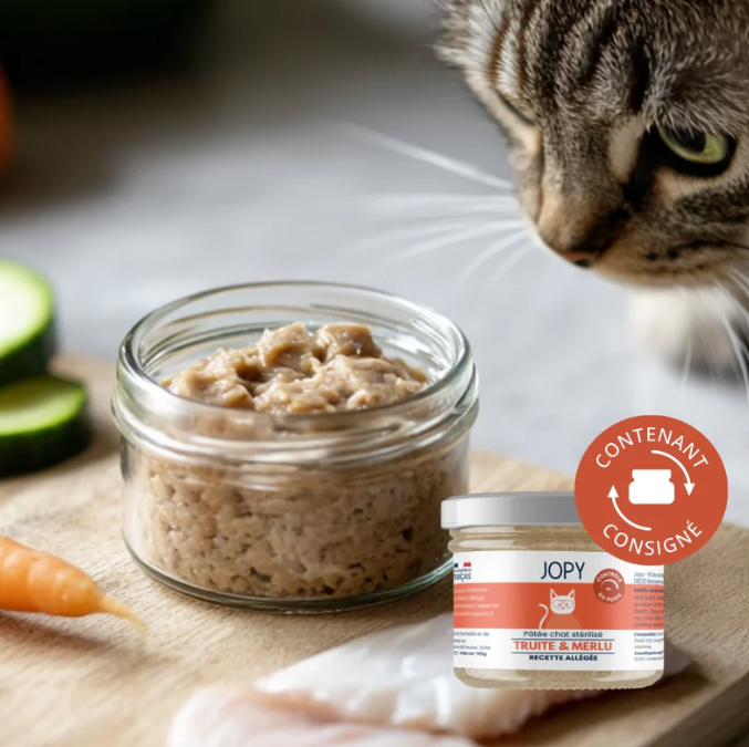 Pour une conservation optimale et respectueuse de la planète, nos pâtées sont conditionnées dans des bocaux en verre consignés , réutilisables et facilement refermables.